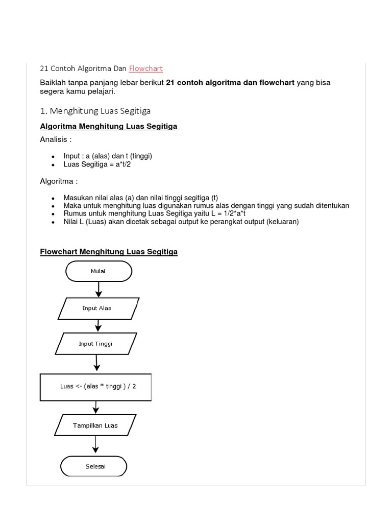Untuk menghitung luas segitiga, maka kita harus mengetahui tinggi dan juga alas segitiga tersebut. Setelah sebelumnya kita sudah membuat contoh flowchart untuk menghitung luas segitiga, kali ini akan saya bagikan flowchart untuk menghitung luas lingkaran.jika kita ingin membuat program menghitung luas lingkaran maka termasuk dalam algoritma sekuensial dimana instruksi dijalankan secara berurutan dari atas kebawah. Contoh berikut adalah algorimat pseudocode untuk menghitung luas lingkaran menggunakan pendekatan bahasa pemrograman pascal dimana jari jari diinput oleh pengguna dan hasilnya dicetak adalah sebagai berikut. Untuk output hasil perhitungan luas dan keliling. A (alas) dan t (tinggi)luas = a*t/2algoritma :masukan nilai alas segitiga (a) dan nilai tinggi segitiga (t),menghitung luasnya dengan alas dan tinggi tertentu.luas segitiga dihitung dengan rumus l= 1/2*a*t,nilai luas (l) di cetak sebagai output ke piranti keluaranalgoritma luas segitiga ( flowchart manual.